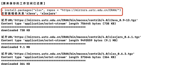 install.packages("xlsx", repos = "https://mirrors.ustc.edu.cn/CRAN/")安装过程如下: