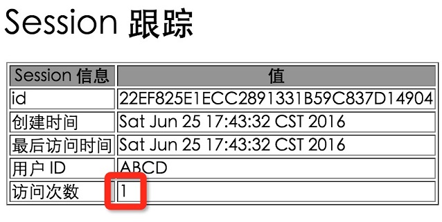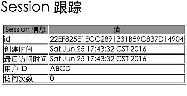 在浏览器地址栏输入 http://localhost:8080/TomcatTest/SessionTrack,当您第一次运行时将显示如下结果: