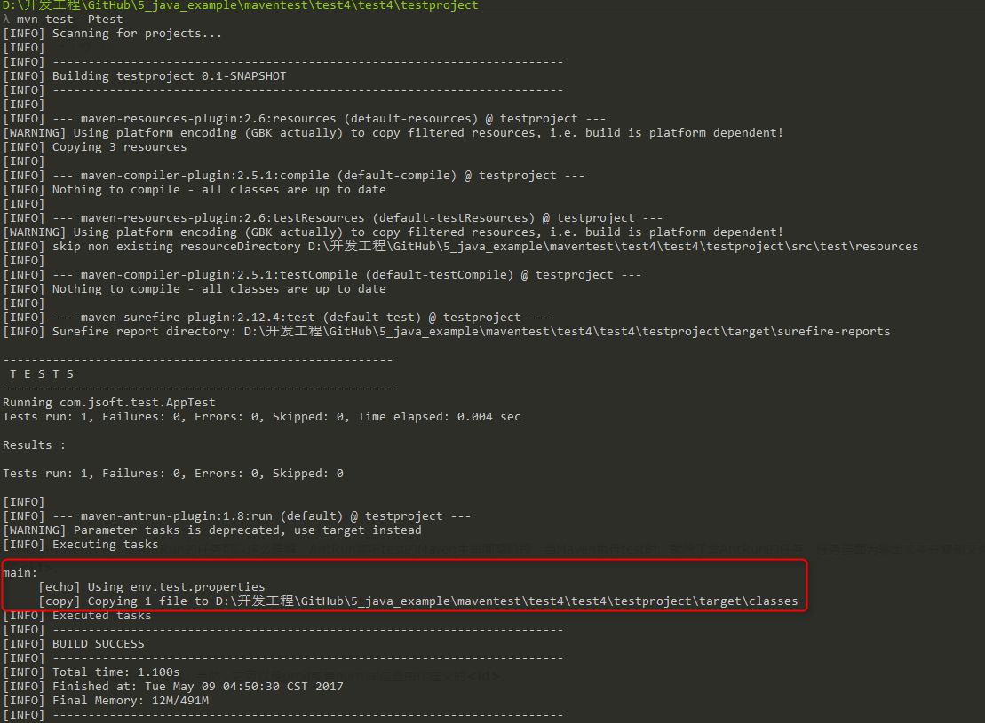 可以看出成功的触发了AntRun的任务。并且是对应构建配置文件下的 <id> 为 test 的任务。