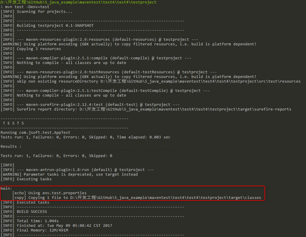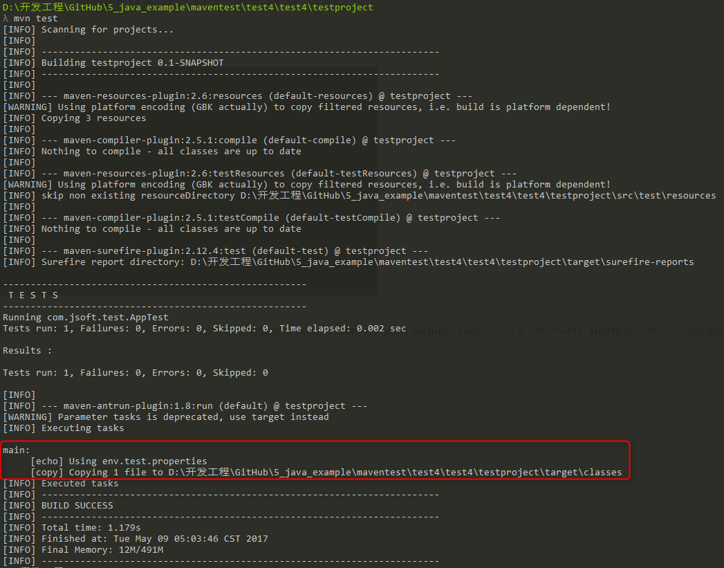 <copy file="src/main/resources/env.test.properties" tofile="${project.build.outputDirectory}/env.properties" overwrite="true"/>