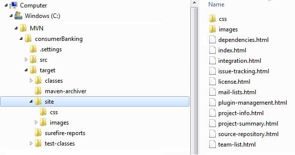 打开 C:\MVN\consumerBanking\target\site 文件夹。点击 index.html 就可以看到文档了。