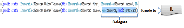 可执行代码在同一个应用程序域中执行,以处理内存中的集合。可枚举的静态类包含用于实现IEnumerable <T>接口的内存中集合的扩展方法,例如List <T>,Dictionary <T>等。Enumerable类中的扩展方法接受Func类型委托的谓词参数。例如,Where扩展方法接受Func <TSource,bool>谓词。然后,将其编译为IL(中间语言)以处理同一AppDomain中的内存中集合。