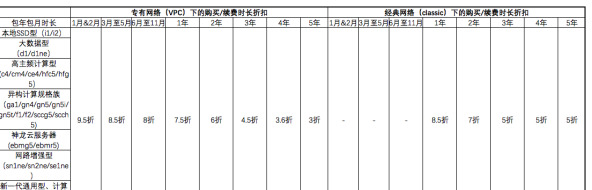 部分产品选择专有网络(具有更高网络性能的特点),您将享有更高折扣。本地SSD型、大数据型、高主频型、网络增强型、异构计算规格族实例和新一代通用型、计算型、内存型实例的优惠: