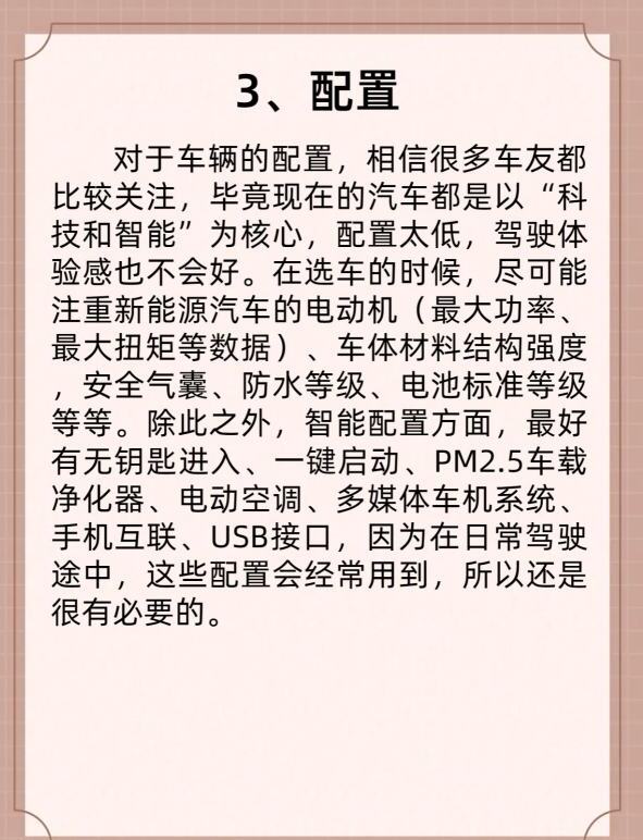 对于车辆的配置,相信很多车友都比较关注,毕竟现在的汽车都是以“科技和智能”为核心,配置太低,驾驶体验感也不会好。在选车的时候,尽可能注重新能源汽车的电动机(最大功率、最大扭矩等数据)、车体材料结构强度,安全气囊、防水等级、电池标准等级等等。除此之外,智能配置方面,最好有无钥匙进入、一键启动、PM2.5车载净化器、电动空调、多媒体车机系统、手机互联、USB接口,因为在日常驾驶途中,这些配置会经常用到,所以还是很有必要的。