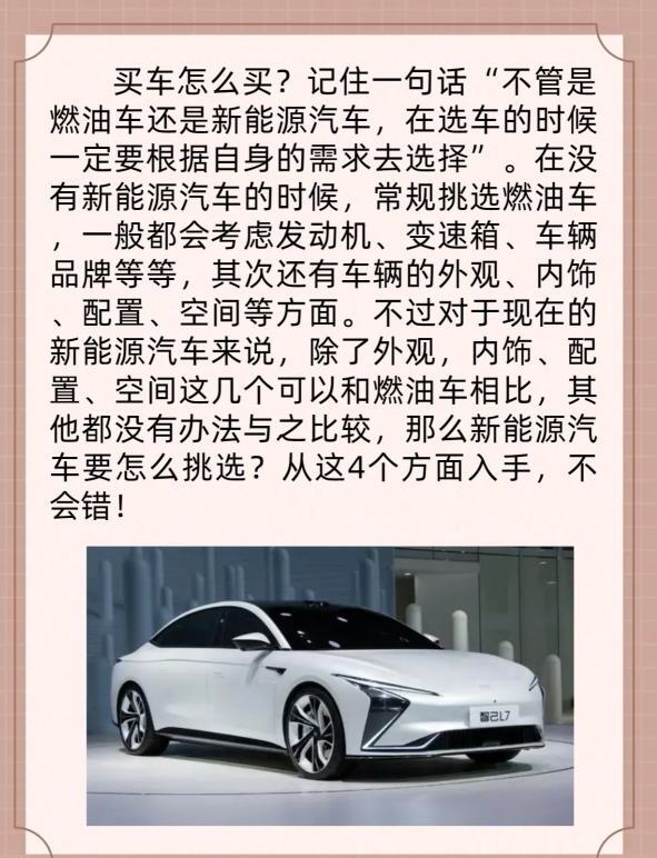 买车怎么买?记住一句话“不管是燃油车还是新能源汽车,在选车的时候一定要根据自身的需求去选择”。在没有新能源汽车的时候,常规挑选燃油车,一般都会考虑发动机、变速箱、车辆品牌等等,其次还有车辆的外观、内饰、配置、空间等方面。不过对于现在的新能源汽车来说,除了外观,内饰、配置、空间这几个可以和燃油车相比,其他都没有办法与之比较,那么新能源汽车要怎么挑选?从这4个方面入手,不会错!