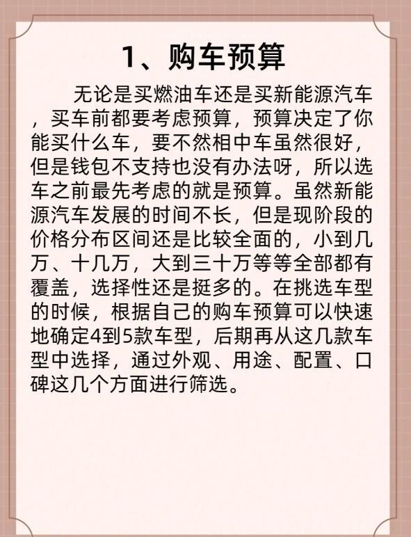 无论是买燃油车还是买新能源汽车,买车前都要考虑预算,预算决定了你能买什么车,要不然相中车虽然很好,但是钱包不支持也没有办法呀,所以选车之前最先考虑的就是预算。虽然新能源汽车发展的时间不长,但是现阶段的价格分布区间还是比较全面的,小到几万、十几万,大到三十万等等全部都有覆盖,选择性还是挺多的。在挑选车型的时候,根据自己的购车预算可以快速地确定4到5款车型,后期再从这几款车型中选择,通过外观、用途、配置、口碑这几个方面进行筛选。