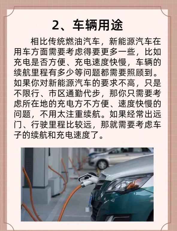 相比传统燃油汽车,新能源汽车在用车方面需要考虑得要更多一些,比如充电迅丛是否方便、充电速度快慢,车辆的续航里程有多少等问题都需要照顾到。如果你对新能源汽车的要求不高,只是不限行、市区通勤代步槐御,那你只需要考虑所在地的充电方不方便、速度快慢的问题,不用太注重续航。如果经常出远门、行驶里程比较远,那就需要考虑车子的续航和充电速度了。