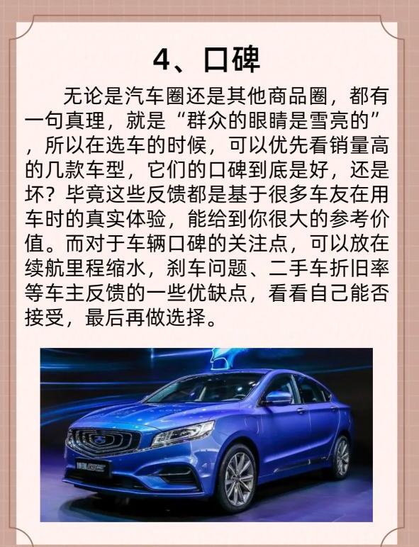 无论是汽车圈还是其他商品圈亩明樱,都有一句真理,就是“群众的眼睛是雪亮的”,所以在选车的时候,可以优先看销量高的几款车型,它们的口碑到底是好,还是坏?毕竟这些反馈都是基于很多车友在用车时的真实体验,能给到你很大的参考价值。而对于车辆口碑的关注点,可以放在续航里程缩水,刹车问题、二手车折旧率等车主反馈的一些优缺点,看看自己能否接受,最后再做选择。