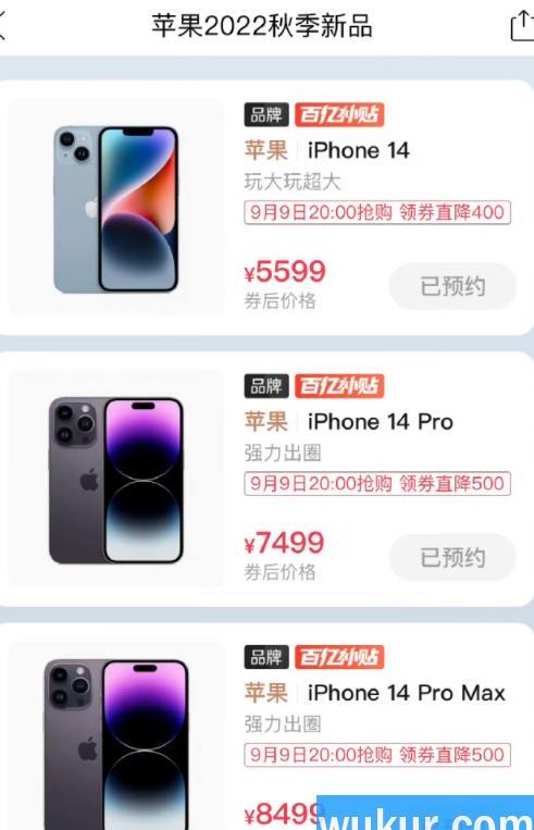 现在,iPhone 14系列率先发布的三款新机也已经在百亿补贴上线,起售价5599元,比官网便宜400元起步。