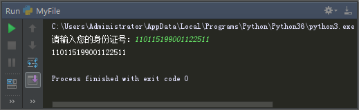 当我们输入内容“110115199001122511”,并按下回车键之后,程序才会继续运行print语句,将变量id中保存的内容显示输出。