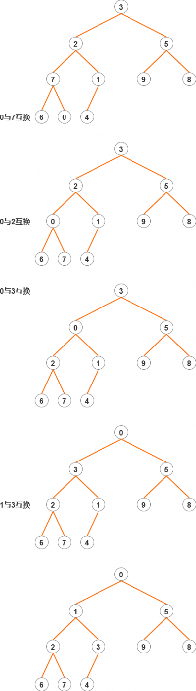 注意,由下至上完成一次调整之后,可能还会存在不符合要求的排列(图中第4步),还要从有问题的位置由下至上继续调整,直到所有排列都符合要求为止。