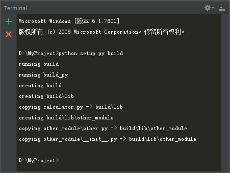 这个时候,程序就自动的创建了一个build文件夹和该文件夹下的lib子文件夹,并且按照我们写好的setup.py脚本,将模块和关联的其它文件复制到了lib文件夹中,完成了安装包的构建。
