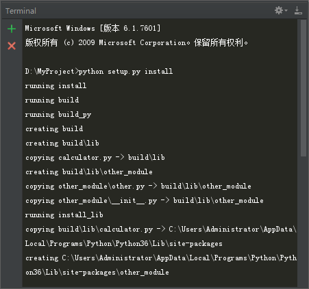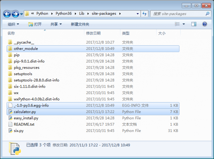 程序自动的执行了build操作,然后将build包中的内容复制到了Python安装目录下的Python36\Lib\site-packages文件夹中,完成了自定义模块(第三方模块/包)的安装。