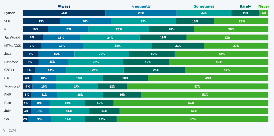 调查结果显示,63% 的受访者表示他们一直或经常使用 Python,这使得该语言成功成为了今年调查中最受欢迎的语言。此外,71% 的教育工作者表示他们正在使用 Python 教授机器学习和数据科学;88% 的学生报告说,他们正在学习 Python,以便为进入数据科学/机器学习领域做好准备。
