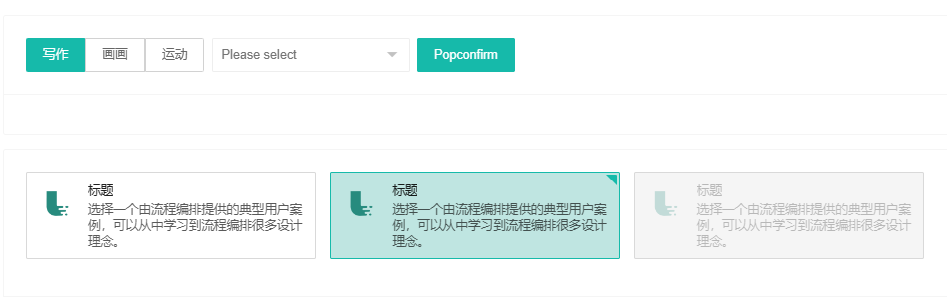 我们加入了 RadioButton 单选按钮,Popconfirm 确认提示 Checkcard 多选卡片 Select-Group 下拉分组 等基础组件。