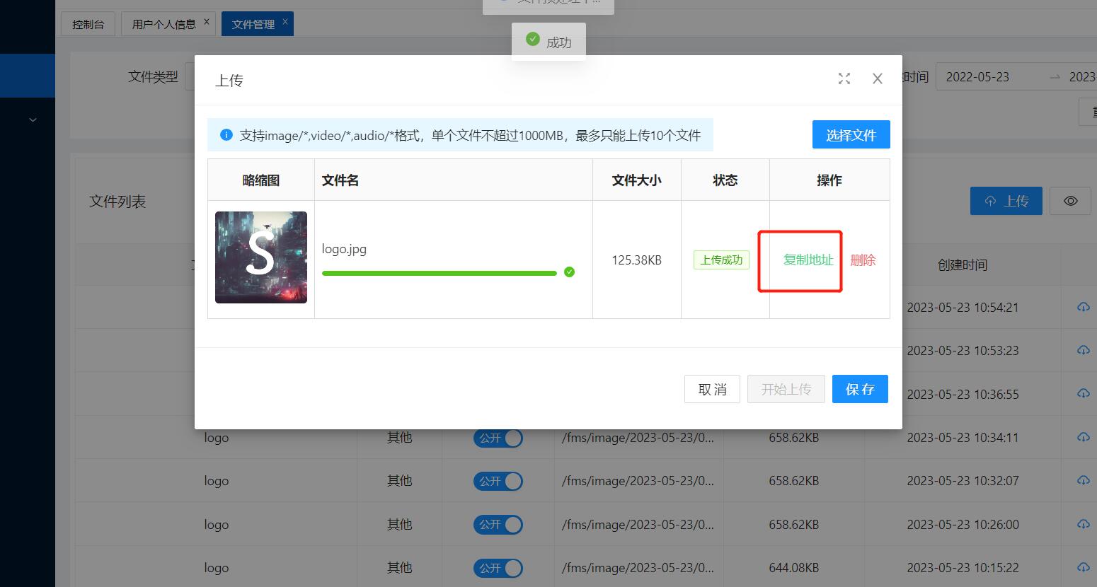 新增: 文件上传列表新增复制地址按钮,用户信息也更新上传头像模块