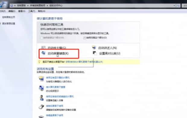 第四:点击进入“轻松访问中心”我们看到一个“启动屏幕键盘”按钮,如图。