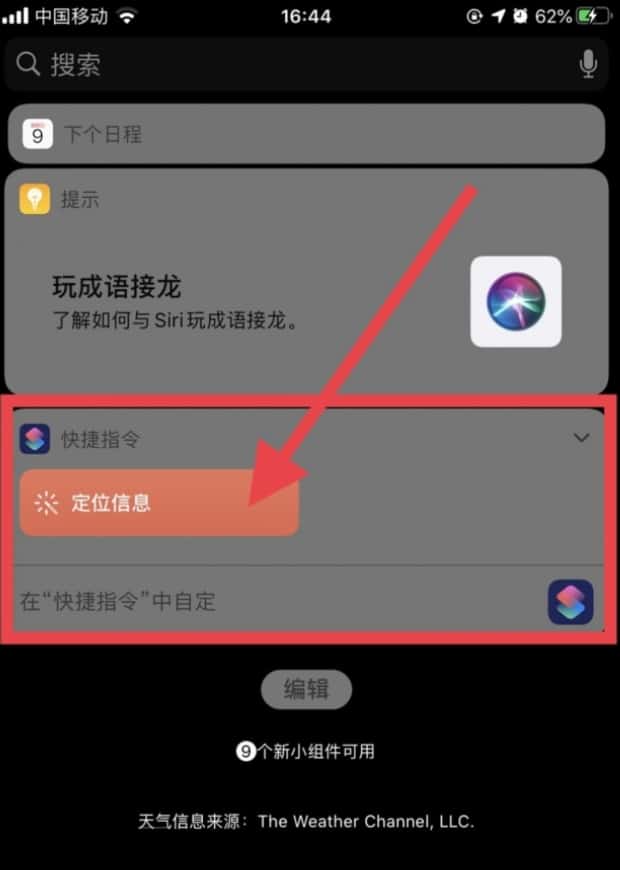 完成定位功能快捷指定后,向左滑动屏幕至搜索页,点击快捷指令,即可启用定位功能。