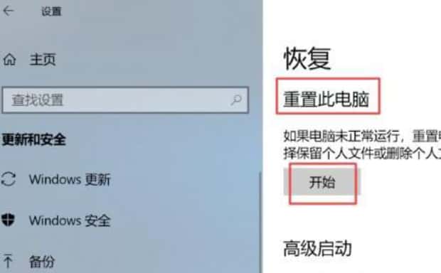 5、弹出的界面,我们可以看到重置此电脑,这个其实就是还原系统,我们点击开始;