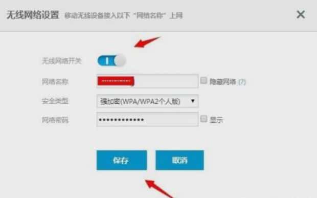 4.无线网络开关要是开启的状态,输入网络名称,安全类型,和网络WIFI密码输入好以后点击保存。