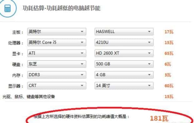 第三:选择自己电脑的配置,可以知道自己电脑的功耗。