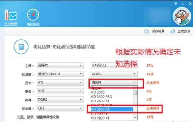 2、然后在功耗估算界面内找到并将为未知项的选项设容置好。