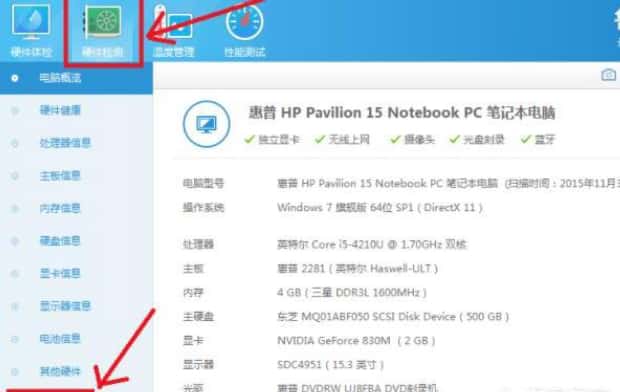 1、首先打开计算机,在计算机内打开硬件检测软件,在软件界面内找到硬件检测和功耗内估算选项并使用鼠标单击。