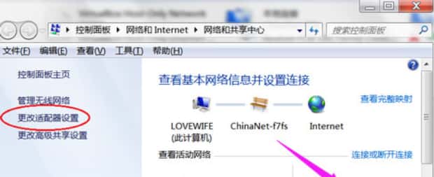 第八:然后用鼠标点击电脑桌面右下角的网络连接图标,进入网络和共享中心,在网络共享中心点击左侧的更改适配器设置进入适配器页面。