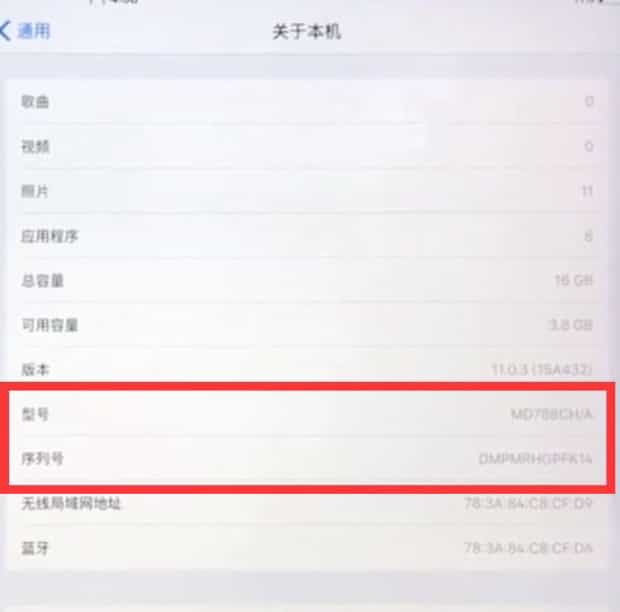 第四:进去之后,可以看到ipad序列号,根据这个序列号,去苹果官网查询,如果能查询到,代表ipad是正品,查询不到,就不是正品。