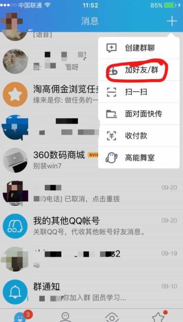 2、选择了“+”号后,选择第二个选项“加好友/加群”,点击进入即可。