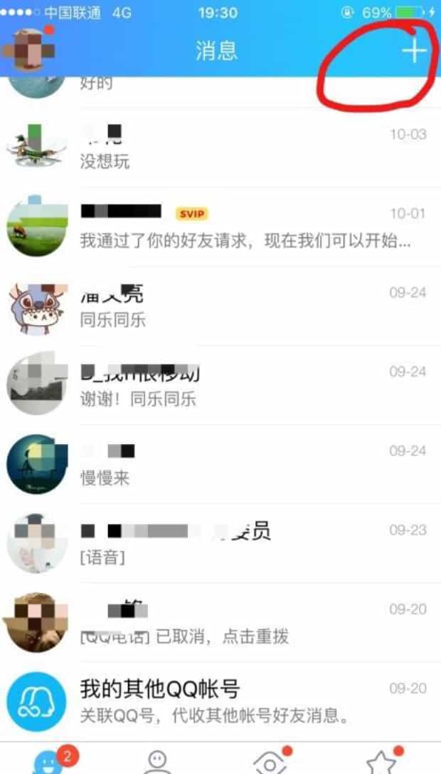 1、首先,打开自己手机上QQ,在QQ的右上角,有一个“+”号,选择这个“+”号。