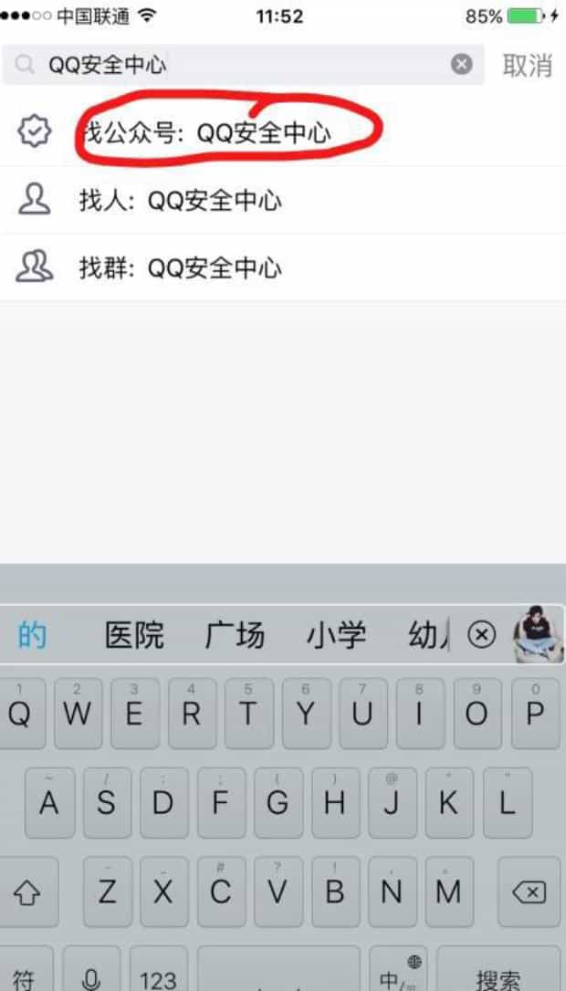 3、进入后,在搜索栏输入“QQ安全中心”,选择第一个公众号,进入即可。