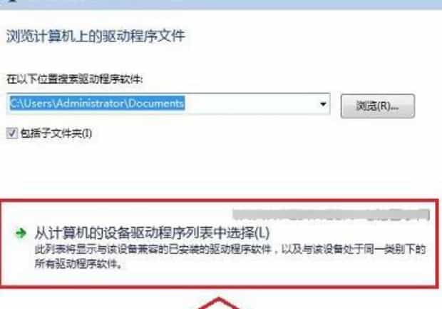 第五:之后会进入浏览计算机上的驱动程序文件选择界面,这里依旧点击底部的【从计算机的设备驱动程序列表中选择】,如下图所示。