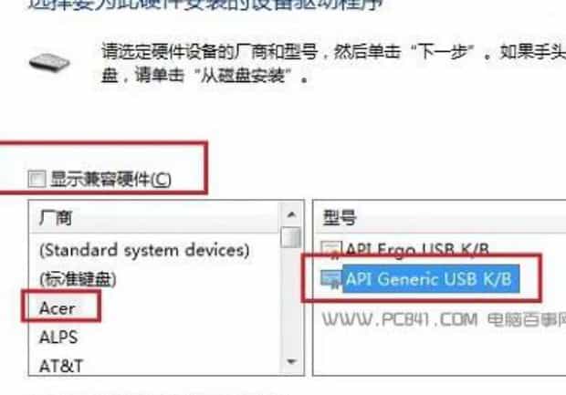 第六:下面的这步“选择要为此硬件安装的设备驱动程序”设置非常重要,首先要将【显示兼容硬件】前面的勾去掉,然后在厂商里,任意选择一个其他笔记本品牌,比如笔者用的是联想笔记本,在这里我们故意选择“宏碁(Acer)”厂商,然后在右侧的型号里,任意选择一个,完成后点击下面的【下一步】,如下图所示。