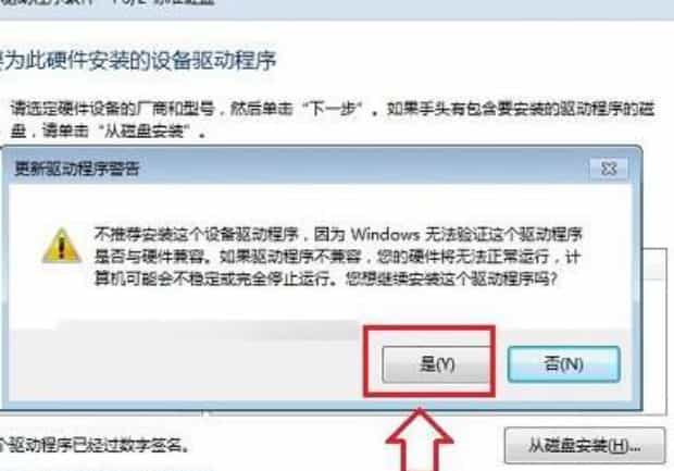 第七:最后会弹出一个“不推荐安装这个设备的驱动程序),因为Window无法验证这个驱动程序是否与硬件兼容。”,这里我们直接点击底部的【是】,如下图所示。