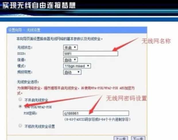 点击下一步,设置无线网名称SSID和密码,一般采用WPA2-PSK加密,选择完成,就成功建立了WiFi网络。