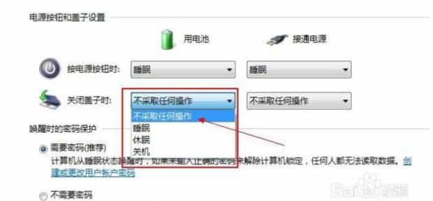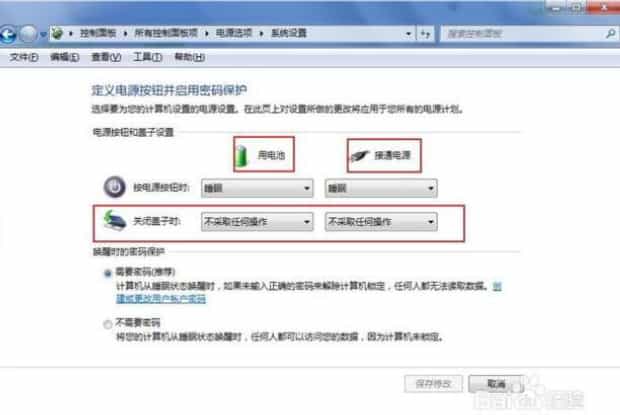 4.下面,我们就看到关闭盖子的功能设置了,这里分为用电池时和接通电源时,大家自行选择即可。
