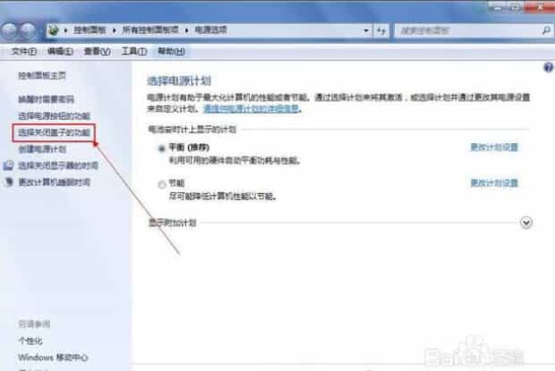 3.在电源选项中,点击左侧的“选择关闭盖子的功能”选项。这里有一些其他选项,这里就不多说了,大家可自行探索。