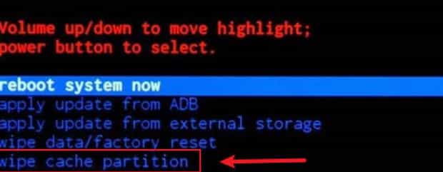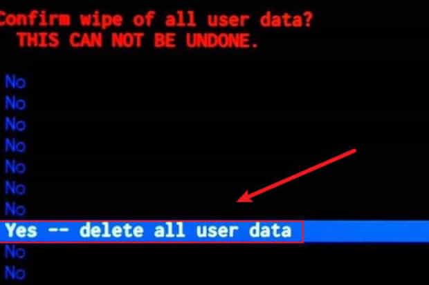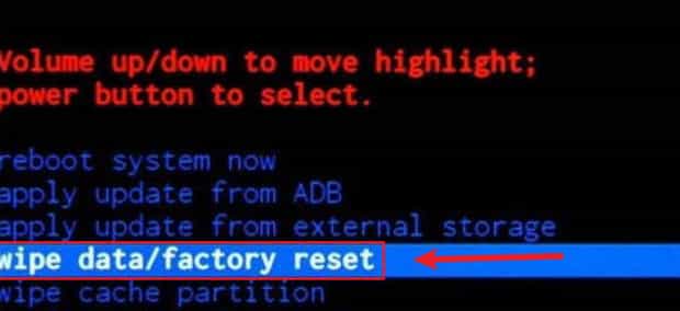 第三:通过”音量+、-“选择”wipe data factory reset“(红框所指),如下图: