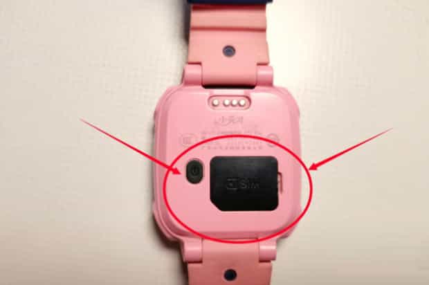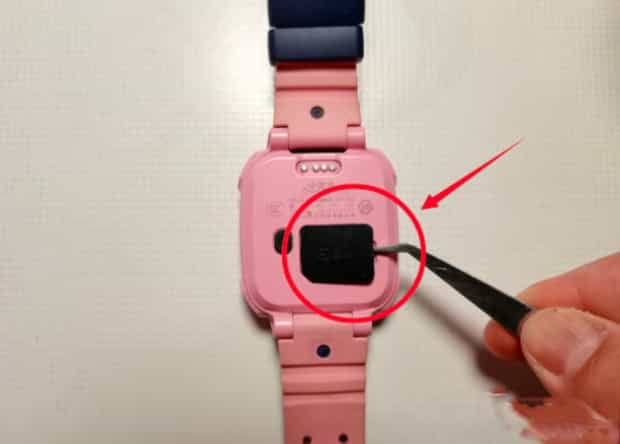 关闭【电话手表】。用小镊子沿着【开关】边上标有【SIM】文字盖子的边缘慢慢撬开电话卡盖。