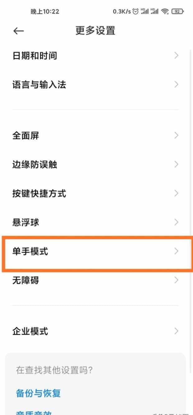 3、在更多设置页面里,可以看到单手模式,点击进入。