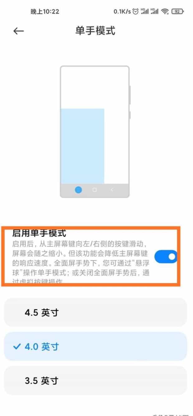 4、在单手页面里,可以看到启用单手模式开关,点击打开,启用之后从主屏幕键向左(右)滑动,屏幕会随之缩小,这样单手模式就设置成功了。