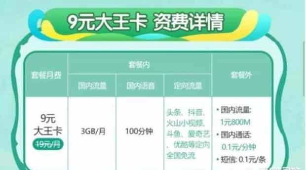 电信为了吸引更多的新用户推出了9元大王卡套餐。每月月租9元,赠送3GB每月的国内流量,同样100分钟的通话,定向流量,一元800MB的套餐外流量。弱点是这款套餐它只适合新用户,并不适合老用户。