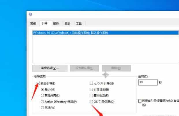 4、在进入引导页面后,我们会发现安全模式下是被勾选了的。我们点击去掉勾选。点击确定、