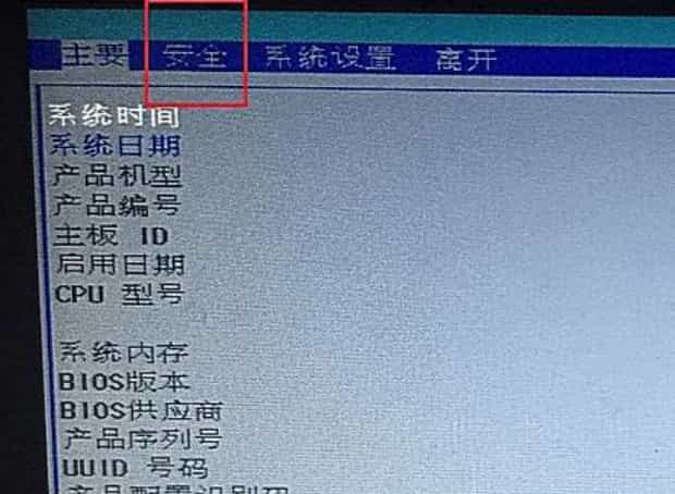 2、接着进入到bios的界面,在界面上方会有一排选项,选择其中的安全选项。