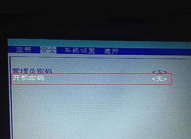 3、进入到安全的设置界面,可以看到下方开机密码的选项,方向键选中后按回车键。
