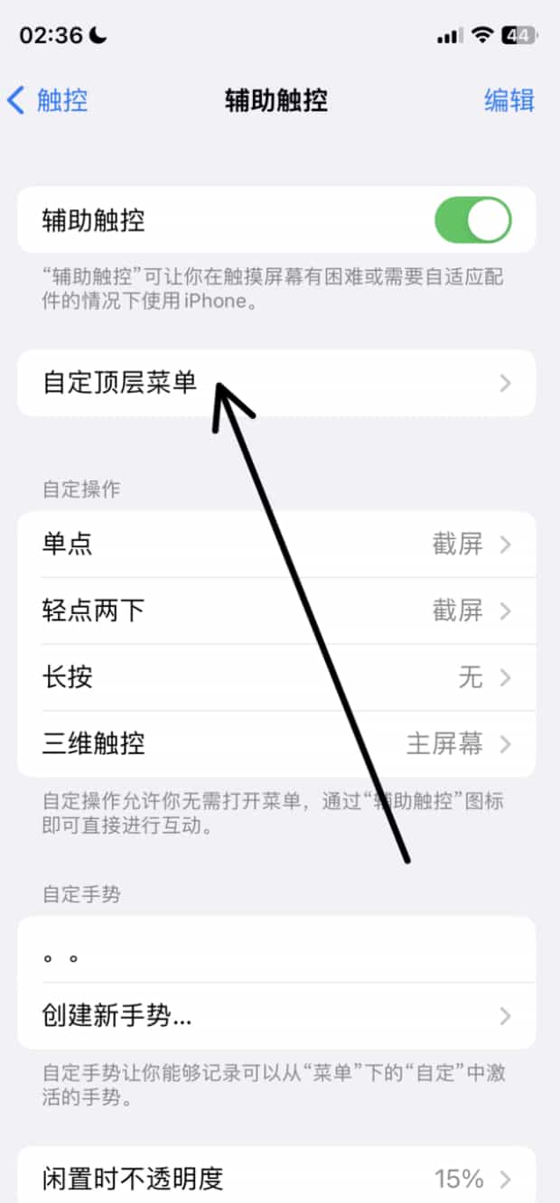 打开辅助触控,打开后屏幕就会出现一个虚拟Home键图标。并点击自定顶层菜单。