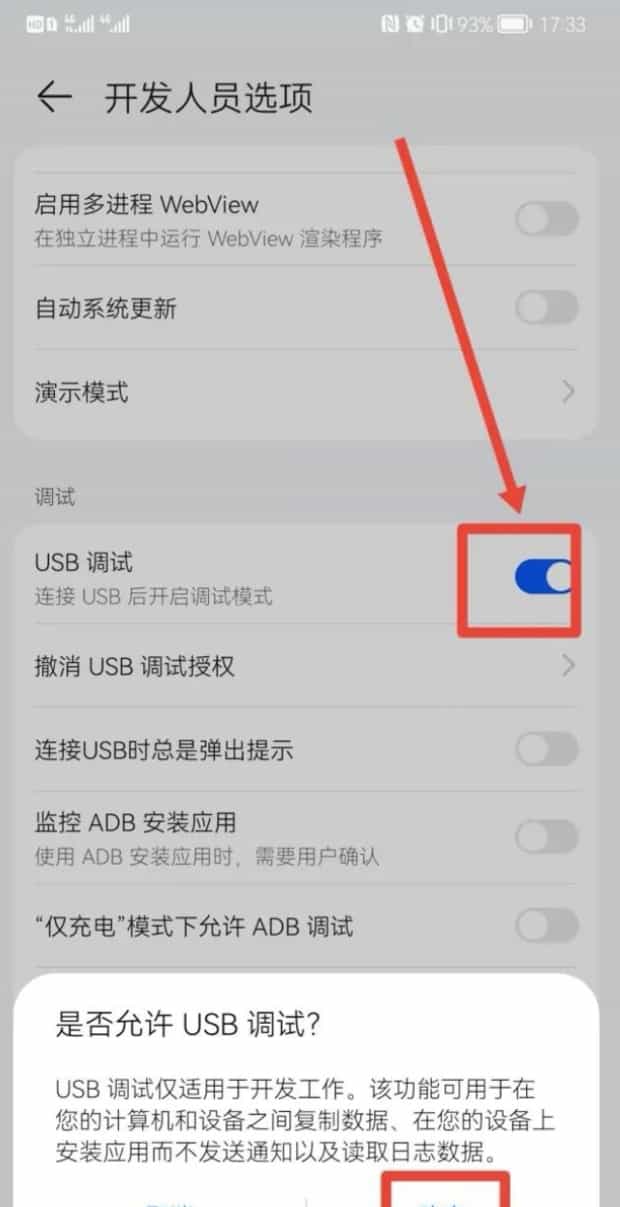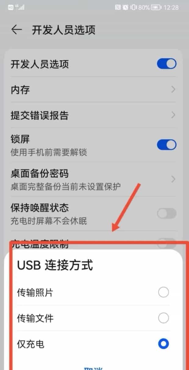 第二:点击开启开发者选项,然后把USB调试给打开。这个时候把数据线跟电脑连接。