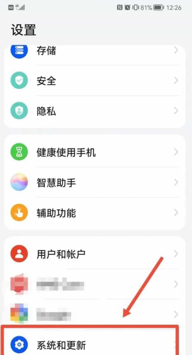 华为p40手机,鸿蒙2.0系统和联想小新笔记本,Windows10系统为例,打开手机设置,点击系统和更新。
