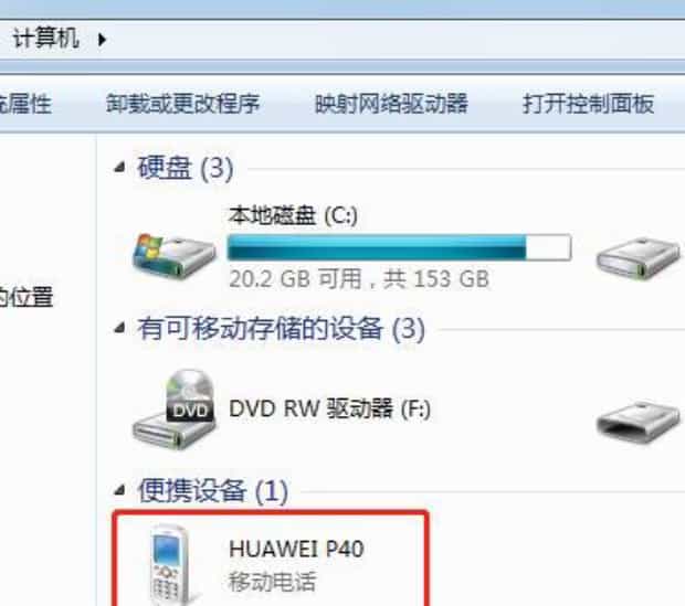 在电脑上进入我的电脑,就可以看到华为P40的存储空间。